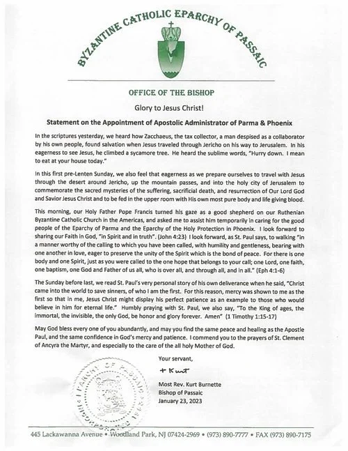 The Holy Father has appointed His Grace, the Most Rev. Kurt Burnette – current Bishop of the Eparchy of Passaic – as Apostolic Administrator sede vacante of the Eparchies of Phoenix and Parma. His Grace, the Most Rev. Milan Lach, S.J., former Bishop of Parma, is appointed auxiliary bishop to the Slovak Eparchy of Bratislava. Bishop Kurt Burnette was born in 1955 at Sculthorpe Royal Airforce Base in England from American parents. His father was serving in the United States Air Force during the Korean War. Bishop Kurt grew up in Corpus Christi, Texas and then Houston, Texas where he attended Rice University, and where his parents helped found St. John Chrysostom Byzantine Catholic Church. He continued his graduate studies at University of Utah where it took seven years to complete a degree because of skiing and the other outdoor distractions of the Wasatch Front.
